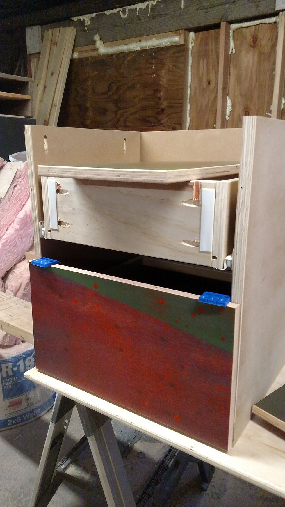 Ready to install the drawer fronts. I learned a trick using double sided tape years ago. All you have to do is get the drawer front in position, then press so the tape holds until you can secure from the back.